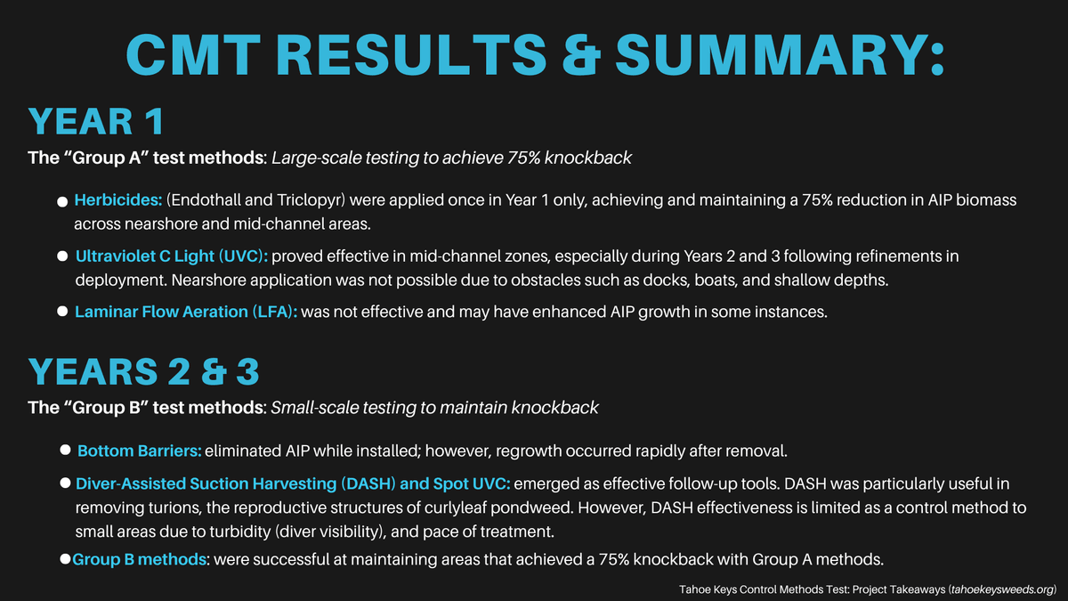 The CMT has informed future decisions for the long-term plan and help TKPOA push for an ecologically sound, economically viable, permittable solution to the aquatic invasive weeds.